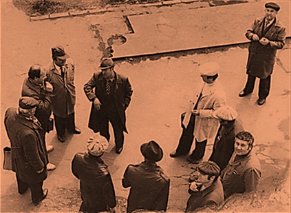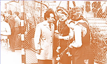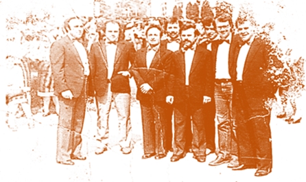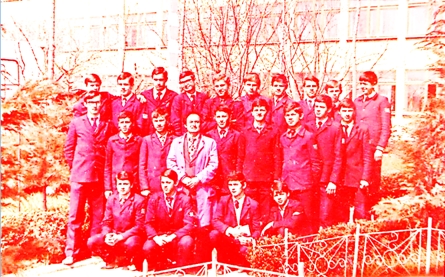 O ședință de lucru, cu unii dintre maiștrii instructori în curtea școlii.În centru, subsemnatul,. În cerc: Coșman, un musafir, Curaleț, Dobroghiu, Grigoriciuc, Danciu, Atănăsoaie, Sochiriac, iar mai la distanță Ciobâcă Ioan